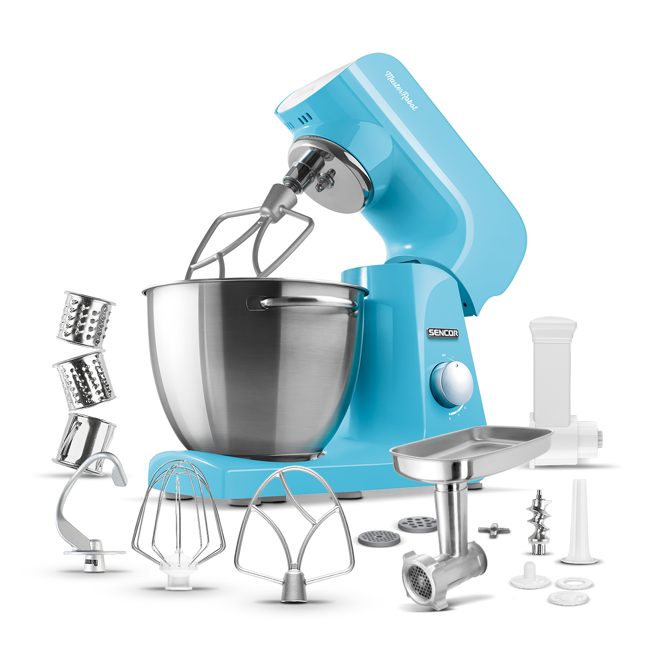 The basic equipment of any stand mixer. An A-shaped beater — ideal for preparing frosting and light unleavened dough. A balloon whisk — excellent for whipping cream and beating egg whites. A kneading hook for stiff, heavy leavened dough.