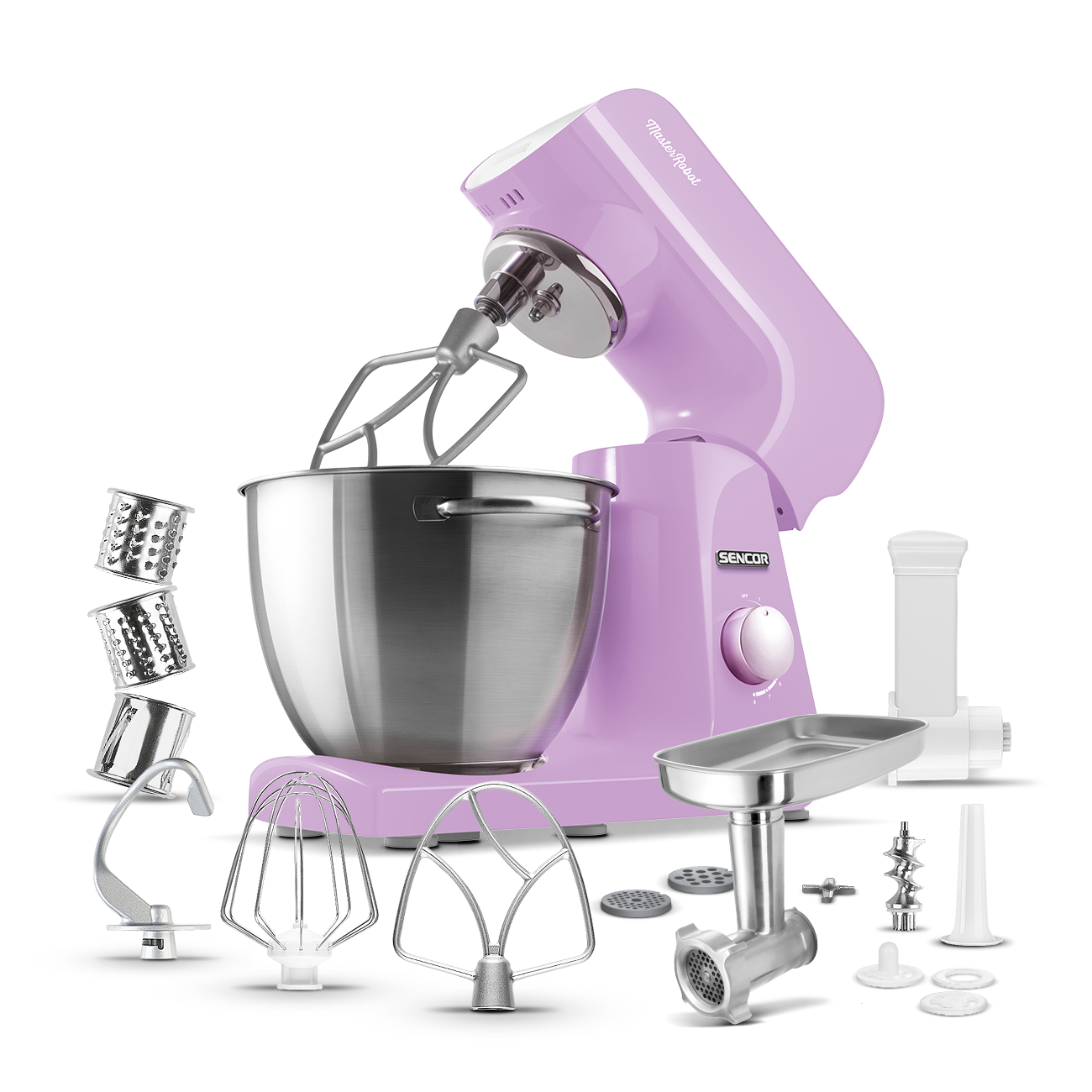 The basic equipment of any stand mixer. An A-shaped beater — ideal for preparing frosting and light unleavened dough. A balloon whisk — excellent for whipping cream and beating egg whites. A kneading hook for stiff, heavy leavened dough.
