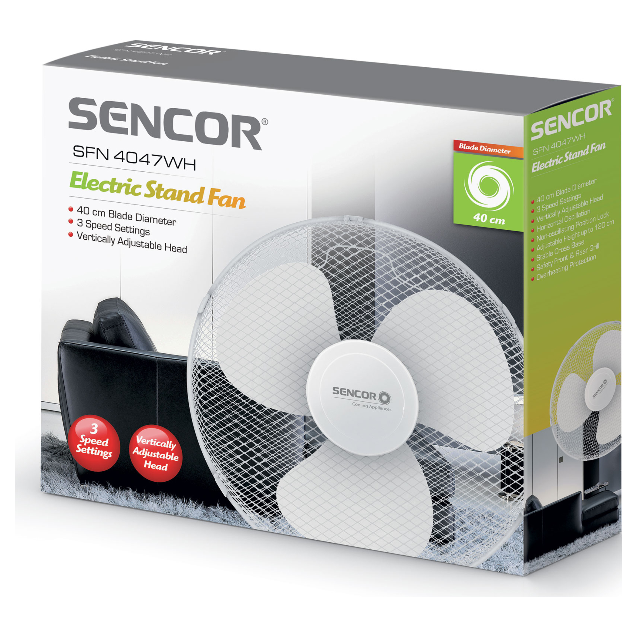 3 niveaux de vitesse, Diamètre de lame de ventilateur de 40 cm, Oscillation horizontale automatique à 90° avec option d’arrêt, Angle d’inclinaison réglable